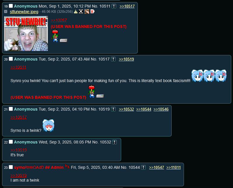 - May 21 2023: After much procrastination, I made a modified version of 8moe's frontend then started a thread on Heyuri.net/b/ (a board I was frequenting at the time) about my new site and from there, some other people posted it on other boards like danger/u/, the Post Office textboard, cudan, Kissu, etc. We start with 4 boards: /en/ - General, /a/ - Anime & Manga, /v/ - Video Games, /h3/ - Meta, and a secret unindexed board /b/ - Random (Way too much for a new site)